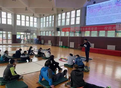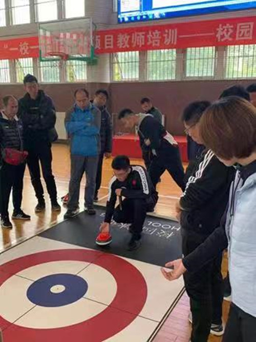 姜瀚普利用自己的专业知识和运动经验,在理论和实操两部分对体育教师进行了培训。理论部分为学员讲述了冰壶运动的规则、冰壶的场地和冰壶的材质及其特点等内容,让体育教师们对冰壶运动有了全面了解。在实操培训中,为体育教师示范了技术动作,让大家体验了冰壶运动。