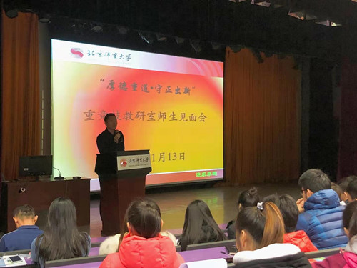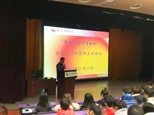 2019年11月13日上午10点在卓越报告厅,召开了重竞技教研室“不忘初心、牢记使命”主题教育暨师生见面会。本次会议由重竞技教研室主任吴建忠主持,教研室全体教师和全体本科生、研究生参加了本次会议。