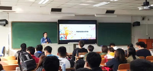分享会上,各位学长学姐从自身考研经历出发,围绕如何选取专业、制定学习计划、调整心态及复试中的注意事项等多方面分享自己的体验与感受,并做了详细讲解。从两门专业课、英语、政治三方面进行分析。提醒大家,依据考试大纲,提前做好充分准备;英语方面,重在练习、掌握技巧、多动脑、勤动手;政治方面,注重答题的条理性、理解出题规律等。在交流环节,备考的同学们也积极与学长学姐互动,学长学姐们结合自身的经历和掌握的技巧进行解答,鼓励大家考研的成功等于正确的方法、不懈的努力、良好的心态以及恰当的复习材料。