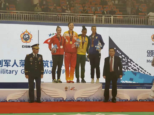 2019年10月23日,第七届世界军人运动会在武汉体育馆开始了跆拳道项目的首日比拼。23岁的李晨在女子73公斤以下级别中,击败德国选手瓦妮莎·科恩德为中国队夺得跆拳道项目首金。赛后,她满怀着骄傲与喜悦,身披国旗绕场一周后,朝着场下两面观众席庄重地各敬了一次军礼。这一幕成为了今日军运会跆拳道赛场最动人的瞬间。