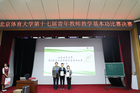 教学基本功是每名教师的必备技能,青年教师教学基本功的提高是保证学校教学质量的关键,从学校发布赛事通知开始,学院和教研室领导高度重视,特邀第四届全国高校青年教师教学大赛文科组一等奖的清华大学彭建敏副教授为公司参赛教师进行赛前指导。全体青年教师精心准备,并积极参赛,杨晓光和郭露露老师在学院选拔赛中脱颖而出,代表学院参加本月19日举行的全校青年教师基本功比赛,并分别获得了术科A、B组第一名的成绩晋级全校决赛。在决赛中,两名教师分别以《力量训练法》和《自由式摔跤——抱双腿技术训练法》为授课题目,授课形式多样、课堂气氛活跃、授课生动形象、充分体现出了公司重竞技项目的特点和魅力,给大家留下了深刻的印象,多次收获现场观众及评委的热烈掌声。最终两名教师获得术科组第一名和第二名,为学院赢得荣誉。