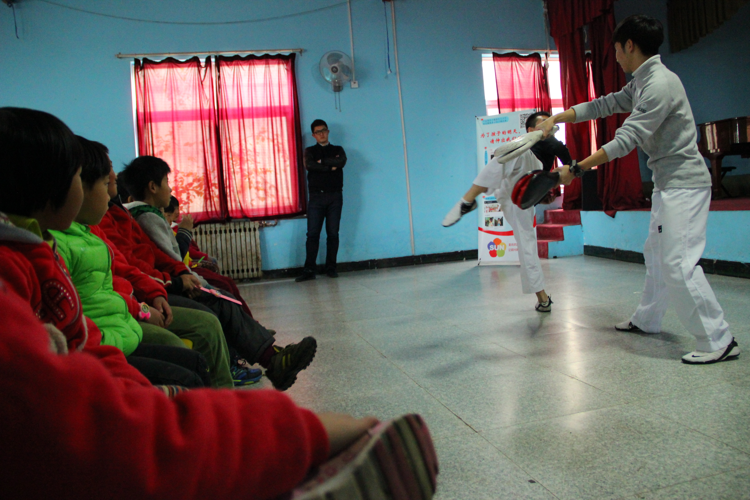 太阳村的房子很整洁,房子的外墙上绘满了各式各样的彩画,房子周围随处可见草坪和树木。我们将捐赠衣物送到孩子们居住的房屋里,他们看到我们的礼物都非常地开心,争先恐后地向我们要,我们把礼物发给他们后,还和他们亲切地交流,了解他们生活里的一些情况。此后进行了简单的跆拳道教学,孩子们非常开心。直到下午三点,我们的志愿活动才结束,我们与太阳村的小朋友们一一告别,然后踏上了回学校的路程。