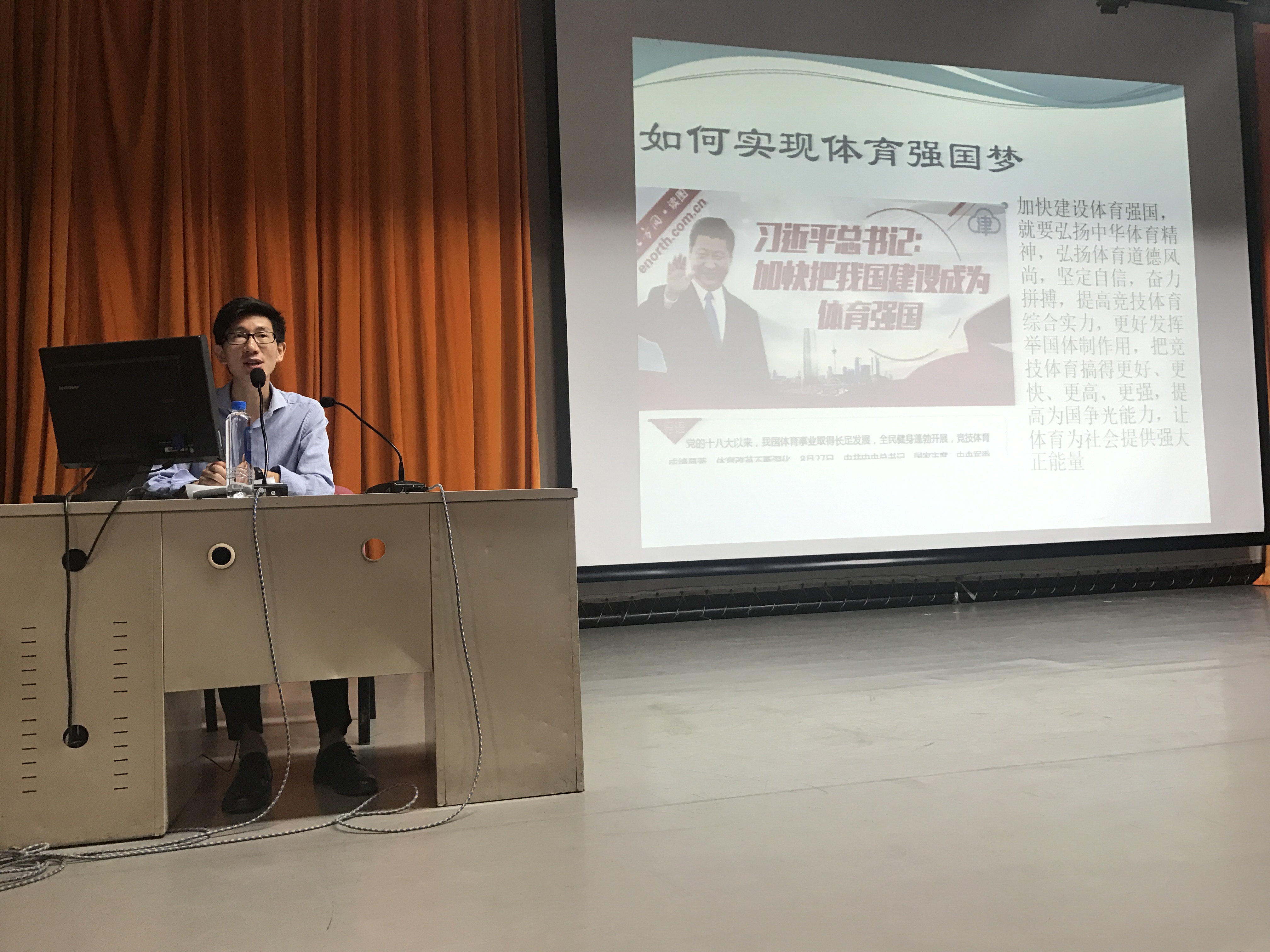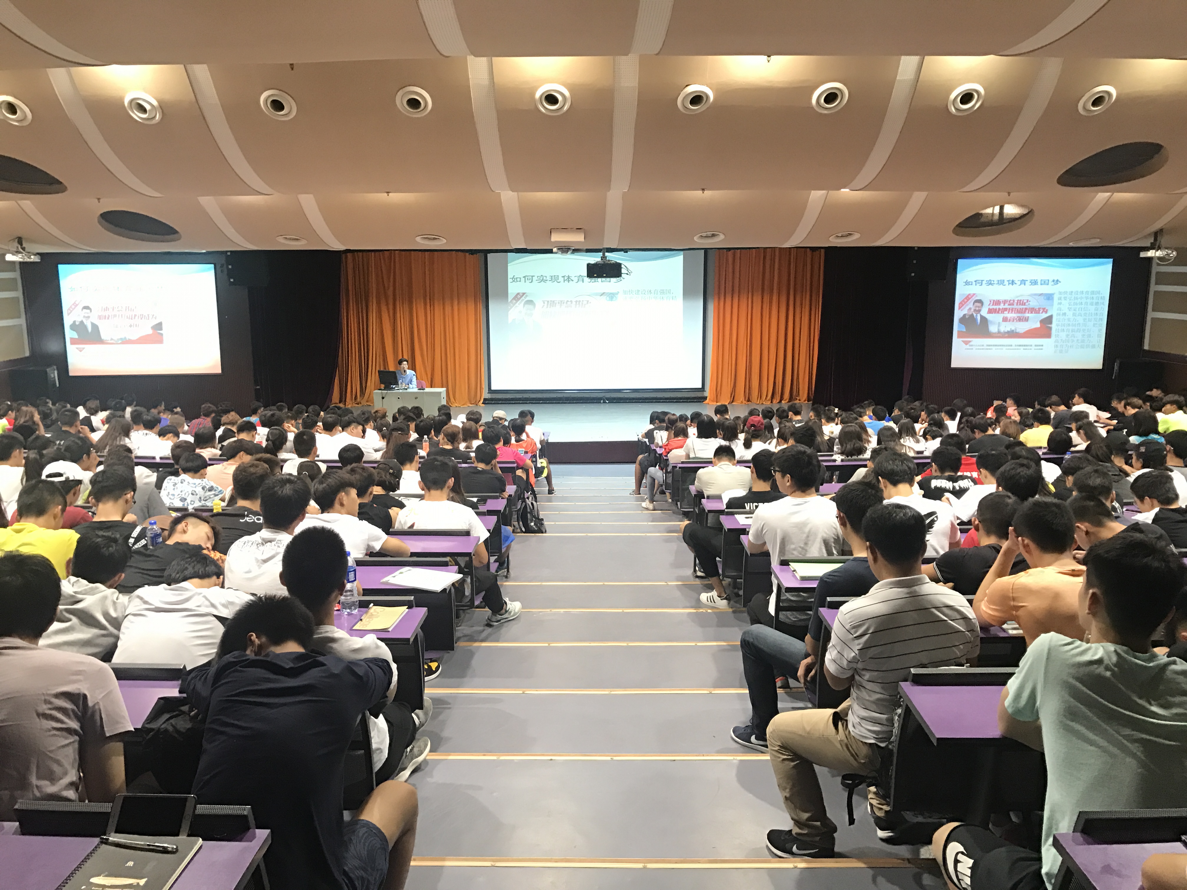 接下来我们很荣幸邀请到马克思主义学院秦彪生老师为全体新生讲述“体育强国梦”专题讲座。体育代表着青春、健康、活力,关乎人民幸福和民族未来。随着,全民健身运动的开展,我国人民的身体素质大大加强。可见体育强则中国强,国运兴则体育兴。体育承载着国家强盛、民族振兴的梦想。因此,我们一定要弘扬体育精神,促进竞技体育快速发展、更快、更高、更强,一定要实现体育强国梦。