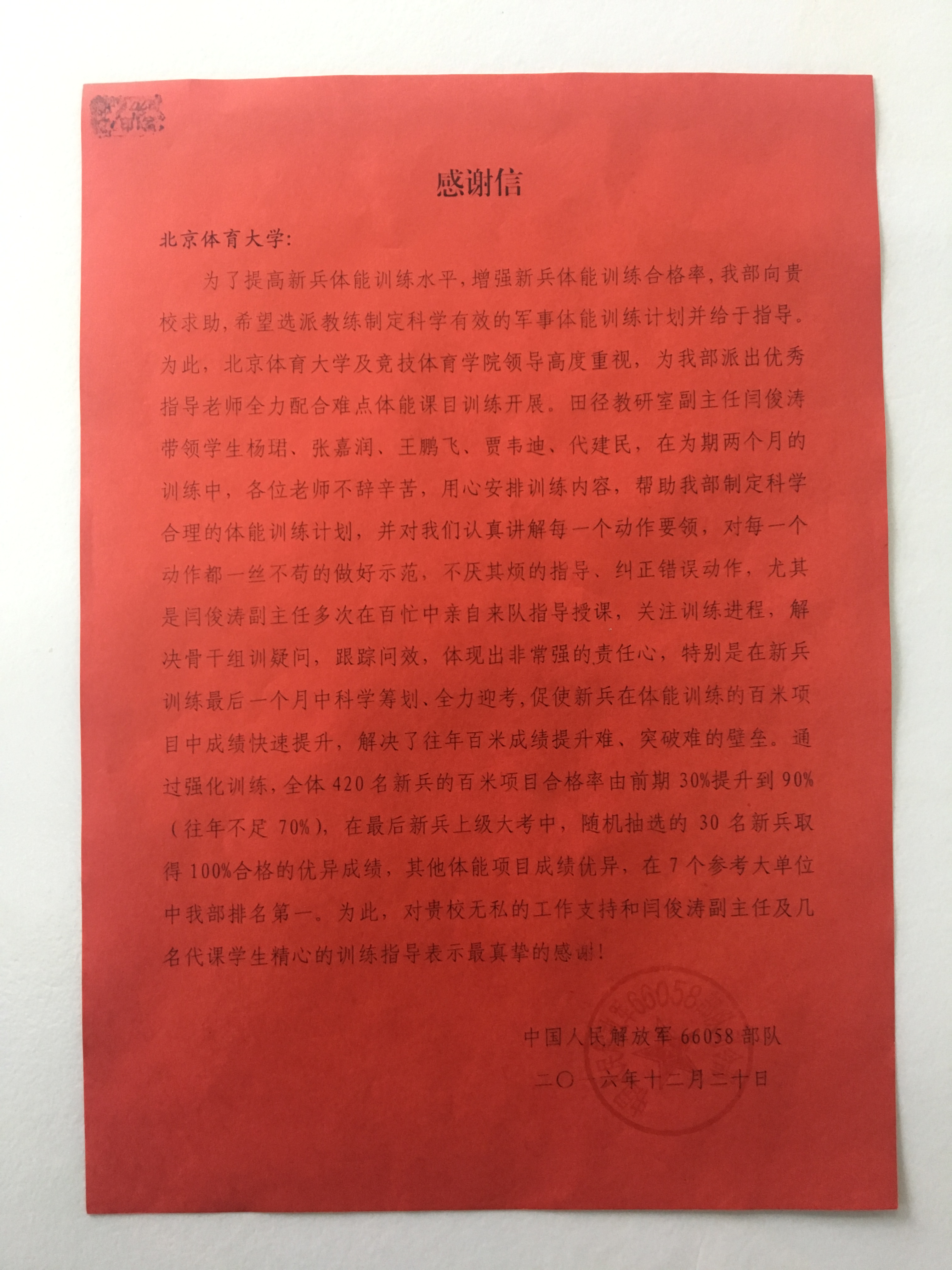 信中对公司田径教研室副主任闫俊涛老师,为该部队战士进行了军事体能训练培训表示感谢,通过闫老师的培训后部队训练考核通过率提升了90%,并在随后的新兵大考中获得第一名。此次军事培训指导,是必威betway与学校共建单位一次合作,闫俊涛老师利用个人休息时间完成学校交办的任务,这次培训也为两个共建单位进一步加深了合作友情。