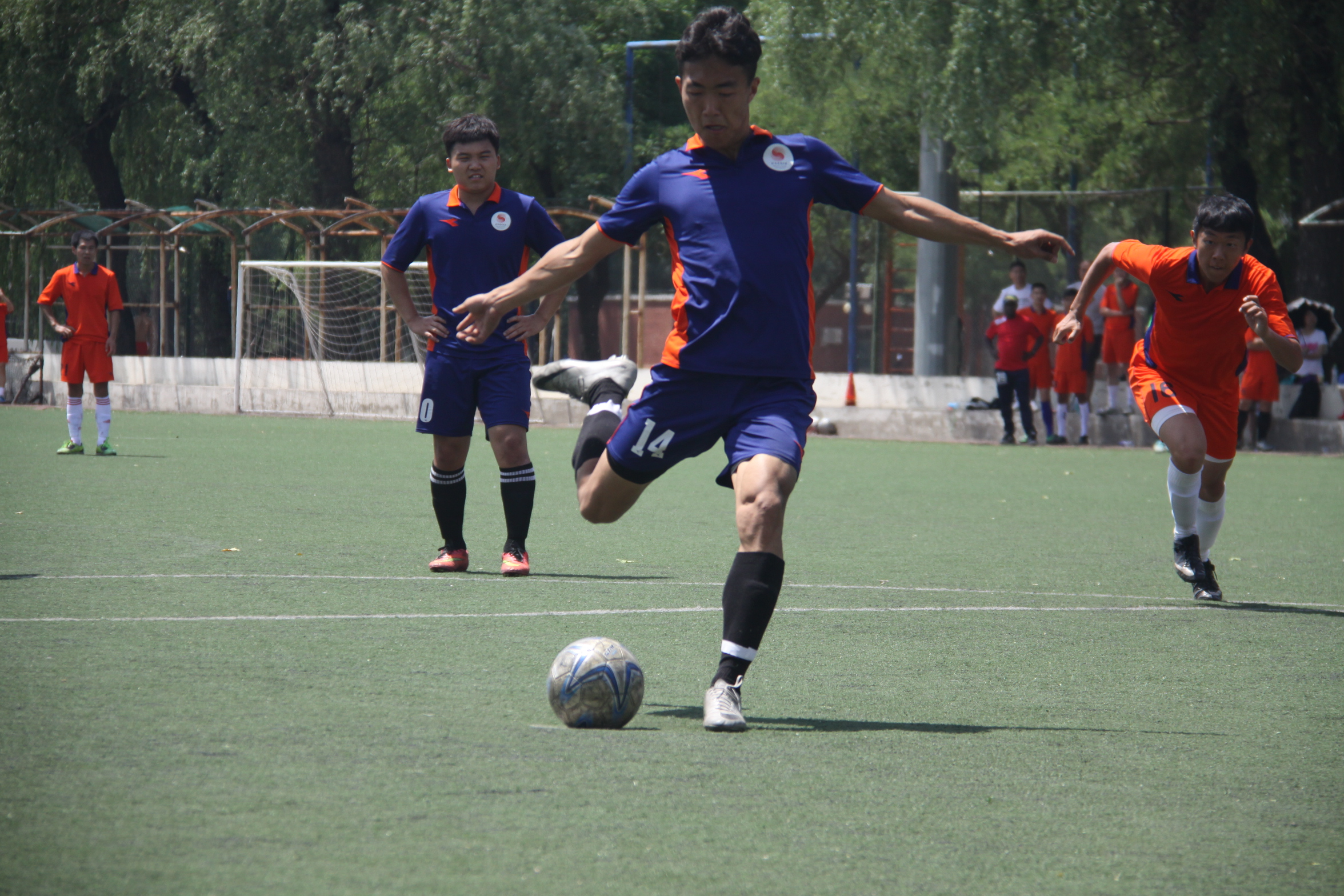 比赛现场天气炎热,却丝毫不影响足球场上球员们的热情。随着主裁判的一声哨响,两队开始激烈的对决。开场7分钟,2013级教练班前锋队员单刀直入,一脚抽射射向球门,然而由于射门角度过正被门将扑出,这一次进攻瞬间点燃比赛的气氛,也使得2013级教练班在后面的比赛中占据场上的主动,多次将球带入禁区,给对方造成很大威胁。研究生队也不甘示弱,组织多次进攻,但都被成功解围。在上半场比赛接近尾声时,研究生队边锋带球突入禁区,一记传中球形成巨大威胁,但门前无人接应,上半场比赛随之结束,双方虽多次进攻但都没有打破僵局。