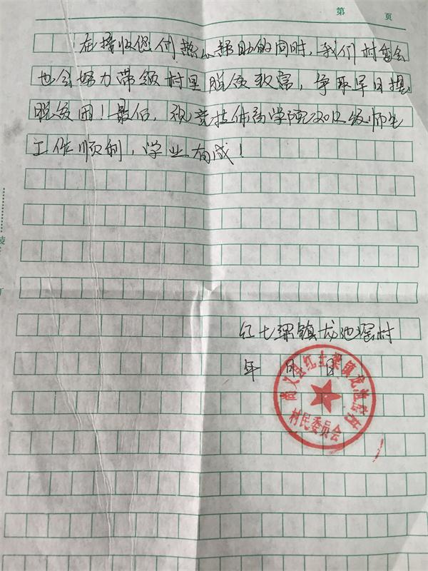 近日,必威betway2012级收到了一封来自河北省尚义县红土梁镇的感谢信。信件简短却充满真情,语言朴实却不乏感动,对必威betway2012级全体师生过去两年爱心捐助的行为表达了感激之情。