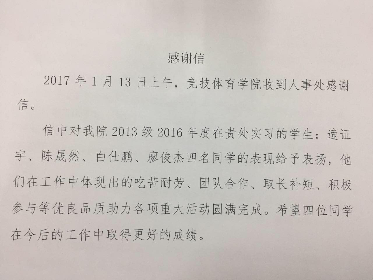 信中对公司2013级2016年度在贵处实习的员工:遆证宇、陈晟然、白仕鹏、廖俊杰四名同学的表现给予表扬,他们在工作中体现出的吃苦耐劳、团队合作、取长补短、积极参与等优良品质助力各项重大活动圆满完成。希望四位同学在今后的工作中取得更好的成绩。