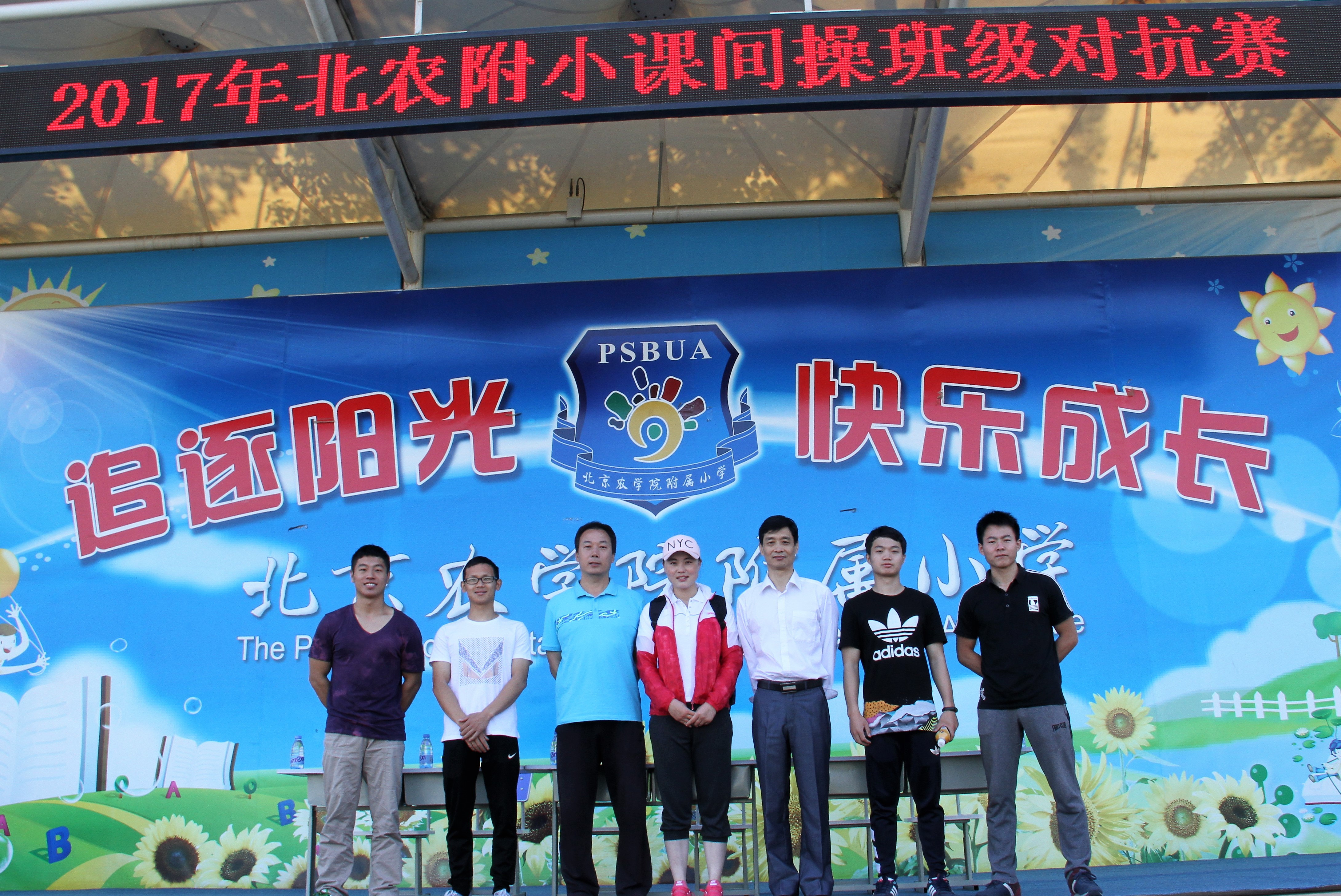5月11日上午,必威betway“高参小”项目合作学校北农附小开展了课间操班级对抗赛,来自必威betway的四位国家级裁判蔡林河、周理平、李小云和穆瑞享以及北京2008年奥运裁判李吉老师担任了本次课间操比赛的评委。